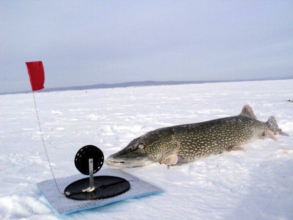 Ловля щуки на жерлицы Отправляясь на зимнюю рыбалку, опытный рыбак непременно захватит несколько жерлиц-щуковок: благодаря этому нехитрому орудию ловли зачастую можно уйти с водоема со знатным трофеем. Эта снасть может быть и самодельной, но наиболее популярны фабричные разборные, снабженные катушкой и антенной-флажком из пружинящей стали, установленные на основание-кружок из пластика. Они занимают мало места, а сборка занимает считанные минуты; удобно и то, что пластик не вмерзает в лед. Оснащение жерлицы Оснащение такой жерлицы простое: леска диаметром 0,4 мм длиной 25 м наматывается на катушку, надевается грузило-оливка (8 грамм) и привязывается поводок с крючком. Последний можно взять металлический, но гораздо лучше зарекомендовали себя поводки из флюорокарбона (0.49) длиной 20-25 см. На поводок через карабин-вертлюжок крепится очень острый крючок-тройник среднего или малого размера. Таких жерлиц-щуковок потребуется от 5 до 15 штук, за большим количеством уследить сложнее. Процесс