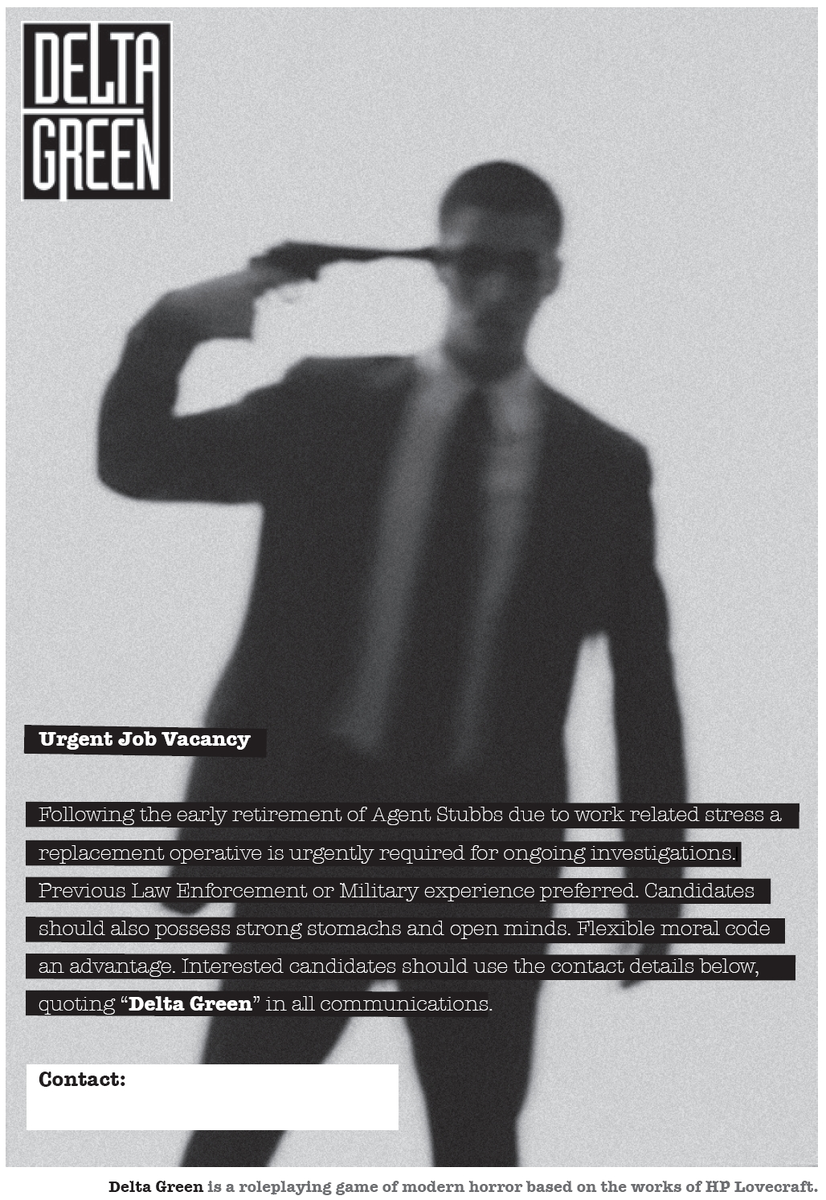 На Delta Green я наткнулся сравнительно недавно и совершенно случайно, копаясь в недрах одного известного архива электронных книг в поисках чего-нибудь интересного. Постер привлек мое внимание, и я решил изучить подробнее, что это за зверь такой, а потом и сводил несколько игр. Delta Green - это хоррор-игра, построенная на движке Call of Cthulhu, делящая с ним общий лавкрафтианский сеттинг, но отличающаяся в ряде ключевых моментов. Например, персонажи игроков - не какие-то случайные люди, столкнувшиеся с неизведанным, а агенты правительственных служб, посланные разбираться с паранормальной активностью. Дельта Грин, собственно, название секретного проекта, набирающего агентов из разных спецслужб. Такой подход облегчает написание предыстории персонажей, их мотивации и причин вообще быть вместе. Кроме того, у персонажей есть так называемые узы(bonds) - вещи, люди, или чувства, которые им дороги. Узы используются для снижения ущерба психике при контакте с чем-то ужасным. Например, агент