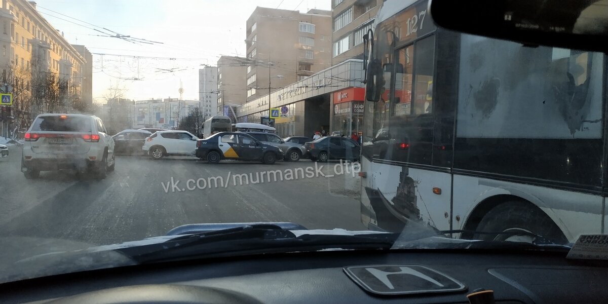 Сегодня в Мурманске на пересечении проспекта Ленина и улицы Академика Книповича произошло столкновение 3 автомобилей. В результате аварии никто не пострадал, однако ДТП парализовало движение на близлежащих дорогах. Столкновение иномарок произошло около 14.00. Судя по фотографиям, машины спускались по Книповича в сторону Шмидта, однако кто-то из водителей не рассчитал дистанцию. Судя по данным сервиса «Яндекс. Пробки», из-за аварии скорость движения на данном участке проспекта составляет не более 10 км/ч. Пробка скопилась по улице Академика Книповича, от Буркова до Шмидта, а также по проспекту Ленина, от перекрёстка до улицы Капитана Егорова. Напомним, сегодня в Мурманской области с утра закрыта автомобильная дорога Заполярный-Сальмиярви. Причиной тому стали неблагоприятные погодные условия.