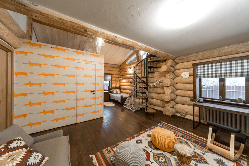Дом наших героев как будто построен не в Подмосковье, а в канадском Саскачеване или американском Вайоминге. "Дачный ответ" создал интерьер в детской соответствующий дому: мы поселили в комнате тотемных животных и оставили для нашего маленького героя простор для творчества.