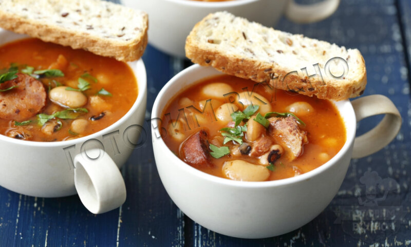 Этот сытный густой супчик в нашем понимании скорее напоминает горячее блюдо, нежели суп, однако, в аутентичном, немецком варианте, это именно суп. Картошка, жареный бекон могут стать отличными добавками к этому супчику. Никаких сложных компонентов! Готовить можно как на любом виде бульона, так и на воде, вместо фасоли брать чечевицу. Самые подходящие специи: тимьян, розмарин, все виды перцев. А в конце статьи вы найдете традиционный рецепт немецкого завтрака, который по достоинству оценят мужчину! Очень сытный и вкусный! Продукты: фасоль - 260гр; томатная паста - 1 ст.л; сардельки - 4 шт; морковь - 1 шт; лук - 1 шт; чеснок - 3 зубчика; мука - 1,5 ст.л; яблочный уксус - 2 ст.л; куриный бульон - 1,5 л; приправы и соль по вкусу. лавровый лист - 2 листа; сахар - 1 щепотка. Способ приготовления: 1.Режем овощи (чеснок, лук, морковь) и обжариваем их на масле, вводим яблочный уксус, томатную пасту, специи, соль и сахар,пережариваем, досыпаем муки, еще пережариваем. Если жарите в кастрюле,