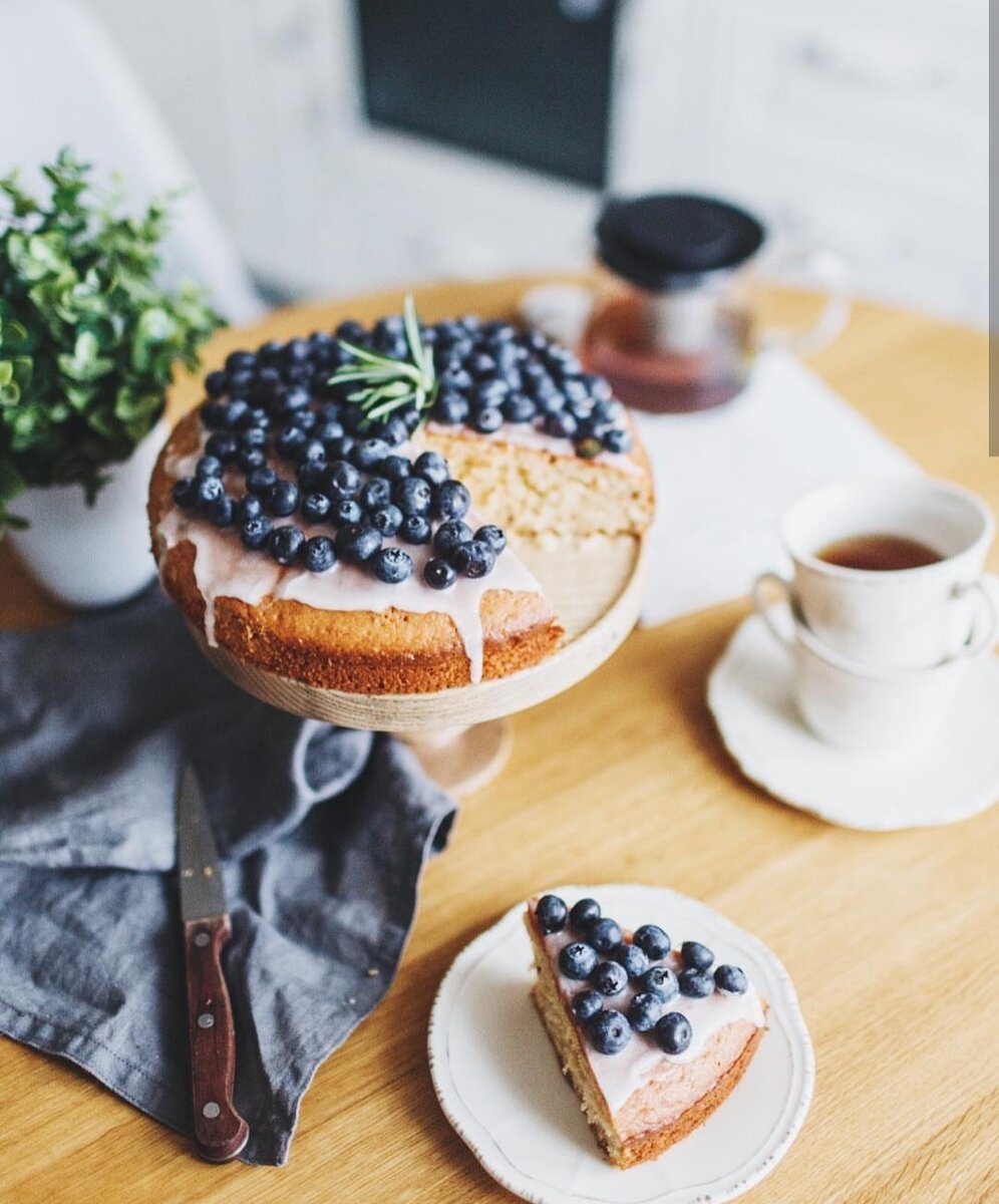 Я взяла 3 яйца, 165 гр сахара (сладкоежки могут взять 180-200гр), 100 гр сливочного масла, 100 гр греческого йогурта, сок и цедру 1 лимона, пакетик разрыхлителя и 220 гр муки. Сначала смешала яйца с сахаром, добавила растопленное масло, йогурт и сок лимона. В конце ввела муку, цедру и разрыхлитель. И на час в разогретую до 165 град духовку. Сверху украсила лимонной глазурью и голубикой.