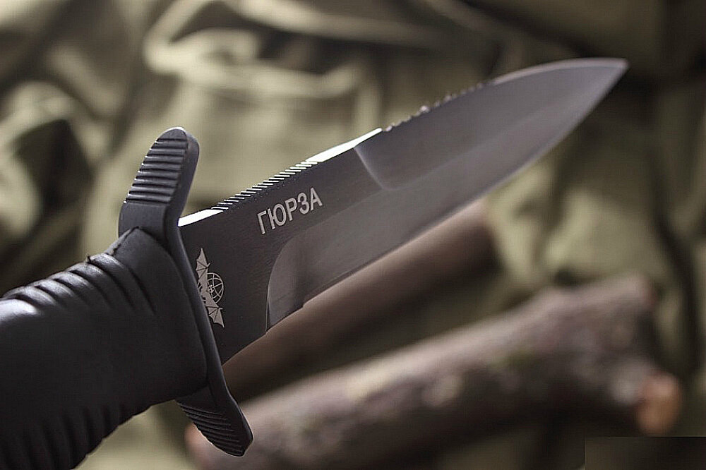 Выпускаемый предприятием "Мелита-К", боевой нож "Гюрза", поставляется силовым структурам нескольких ведомств РФ по спец. заказам. Этот боевой нож обладает сравнительно узким клинком, длина которого составляет 155 мм. Копьеобразная форма, способствующая более легкому проникающему удару. Заточка полуторная. Небольшая часть обуха заделана под серрейтор. Это дает возможность бойцу, владеющим клином, использовать нож для резки тросов, канатов, веревок, а также в качестве пилы. Клинок боевого ножа "Гюрза" может быть изготовлен из нескольких сталей: "70Х16 МФС" или "50Х14 МФ". Твердость, как правило, колеблется от 52 до 56 HRC. Наносится специальное темное антибликовое покрытие. Надежная крестовина, блокирующая соскальзывание вашей руки на лезвие ножа при колющем ударе. Боевые упоры загнуты вперед (в сторону лезвия). Рукоять всадная, из прессованной кожи или же термоэластопласта. Можно встретить вариант с металлическим навершием у рукояти. Отверстие под темляк присутствует. Комплектуется нож