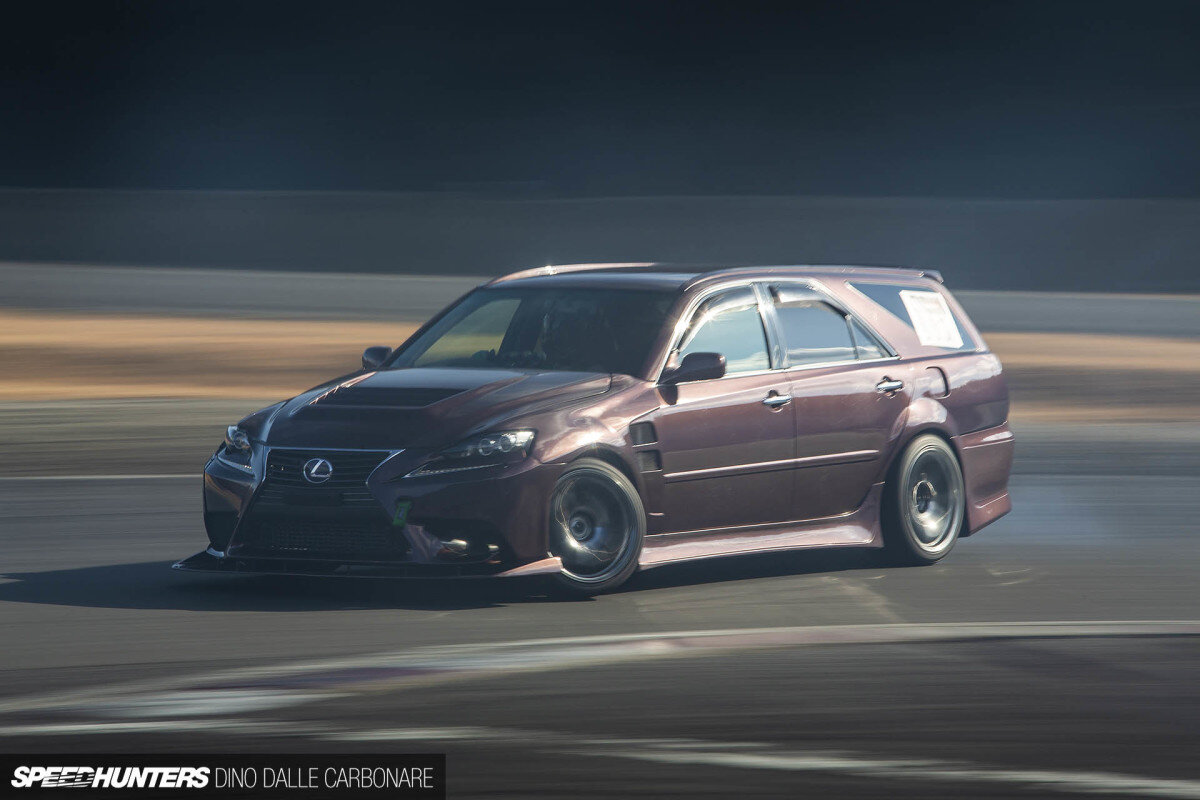 Не знаю как вы, а я люблю сараи. Особенно если они на джейзете и собраны для дрифта. Ситуации, когда странноватые универсалы смешиваются с группой дрифт-каров на небольших треках вроде Nikko Circuit, не такая уж редкость. Все знают, что японцы способны веселиться со всем, что попадет под руку. Эту машину построил Казама-сан из Kazama Auto специально для Токийского автосалона несколько лет назад, и с тех пор я ее не встречал. Позже авто продали, но, к счастью, новый владелец использует всю мощь, скрытую за фейсом Lexus IS, на полную катушку. Экстерьер стокового Mark II Blit довольно своеобразен, с этим багажником, будто просто приставленным сверху кормы седана и новыми передними фарами, для пущего отличия от обычного «стодесятика». Но как бы там ни было, главное что тачка на заднем приводе и может быть вооружена 1JZ-GTE. Лексус всегда пытался конкурировать с «большими» немцами, но в отличии от них, так и не выкатил солидный универсал. То, что не пришло в голову чувакам из Лексуса, з