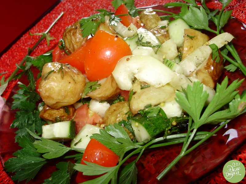 Этот овощной салатик сытный, вкусный и красивый. А еще мне очень понравилась заправка. Ингредиенты: 15 молодых картофелин среднего размера, 5-6 мелких помидоров, 2-3 огурца, 2 болгарских перца, 2 горсти руколы (можно взять петрушку, укроп и сельдерей), 2-3 зубчика чеснока. Заправка: 1 ст. л. лимонного сока, сухие травы: базилик, тимьян, орегано, оливковое масло, морская соль, щепотка свежемолотого черного перца, 1 ч. л. меда, 1 ч. л. французской горчицы в зернах. Приготовление: Молодой картофель вместе с кожицей отварить в мундире, затем разрезать пополам или на четвертинки, выложить в форму для запекания и щедро сдобрить оливковым маслом. Поперчить, посолить и отправить в духовку под гриль, чтобы картофель стал золотистым (сильно прожаривать не надо!). На готовый картофель выдавить чеснок и перемешать. Охладить. Зелень положить в салатник. Овощи крупно нарезать и тоже отправить в салатник. Добавить картофель. Для заправки все ингредиенты смешать и одставить на несколько минут, чтобы т