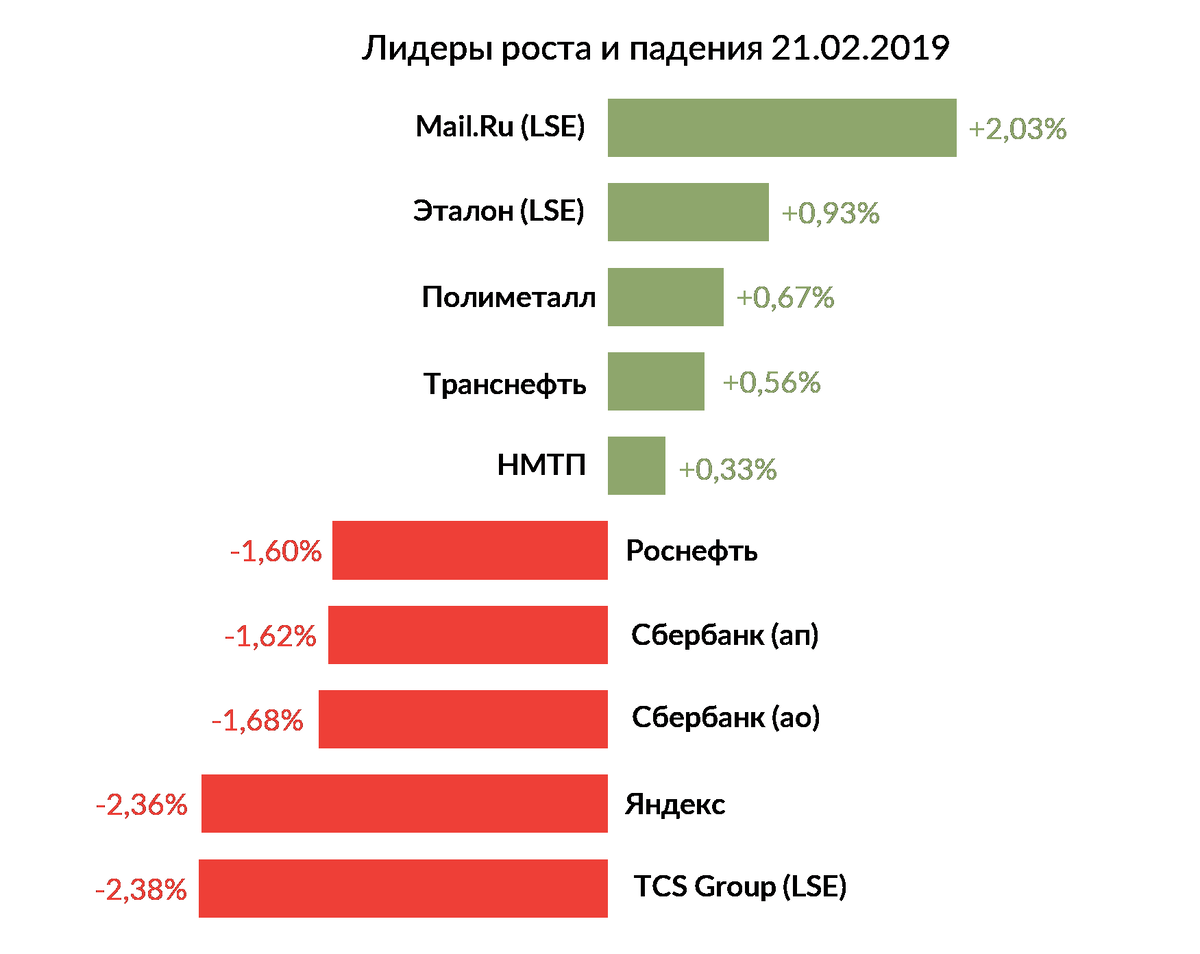 В числе аутсайдеров оказались TCS Group (LSE −2,38%), Яндекс (-2,36%), Сбербанк ао (-1,68%), Сбербанк ап (-1,62%) и Роснефть (-1,6%).