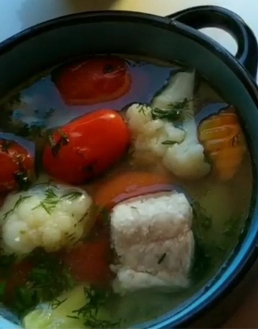Основными продуктами кухни Бенина, в западной Африке, это овощи. В самых различных способах приготовления. Самое основное блюдо "Калалу" (Calalou / calau) — суп из овощей, мяса и морепродуктов. Предлагаю приготовить вкусный и сытный суп для всей семьи. Продукты как всегда самые обычные. Ингредиенты: 350 грамм любой рыбы 200 грамм цветной капусты (можно замороженной) 2 штуки моркови 1 штука репчатого лука 1 упаковка томатов черри 4 средних размеров картофеля 1 пучок укропа соль перец Алгоритм приготовления: 350 грамм рыбы помыть, очистить от плавников. Поставить на огонь кастрюлю с водой. Как только вода закипит помещаем рыбу. Варим на медленном огне 40 минут. После того как рыба сварилась, убираем остужаться. Бульон процедить, влить ещё немного воды. 4 картофеля моем, очищаем от кожуры. Режем на средние кубики. Перекладываем в кастрюлю. Томаты черри моем, осушаем. Ложем в кастрюлю. 2 штуки моркови моем, чистим шкурку. Режем на средн