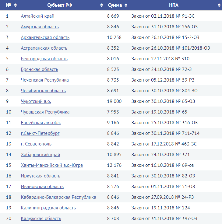 Здравствуйте, в данной статье вы найдете таблицу с величиной прожиточного минимума для пенсионера по всем субъектам РФ. Первые 20 регионов: Вторые 20 регионов: Третьи 20 регионов: Четвертые 20 регионов: Спешим заверить, что все данные был взять с официального сайта Пенсионного Фонда России.