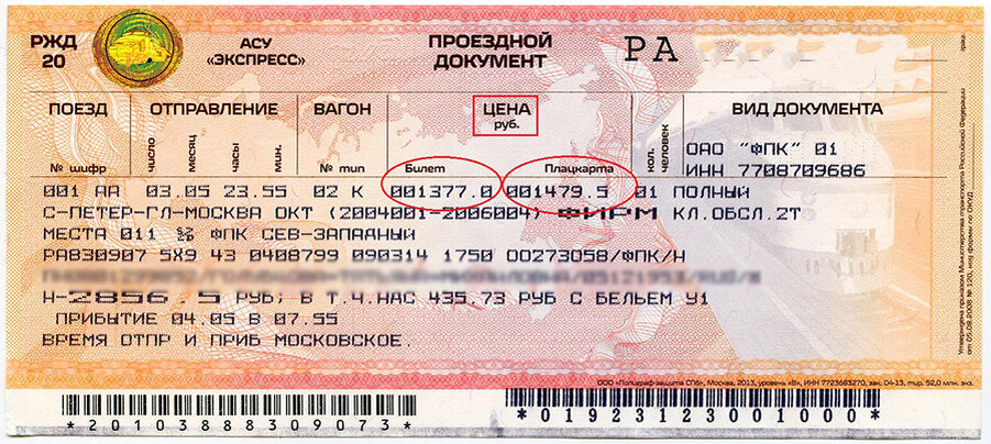 А теперь подробно. Когда покупаете билет на поезд, вы платите сразу за несколько вещей: за услуги РЖД (это графа «стоимость билета» на бланке), за использование вагона (графа «стоимость плацкарты») и сервисные сборы, которые в бланке не прописаны.