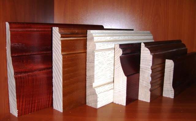 Массивный плинтус, т.е. выполненный из цельного массива древесины, идеально подойдет к полу из массивной доски, и по своим качествам вполне ей соответствует. Производители массивной доски выпускают и плинтус из массива, под собственные коллекции – так достигается полная гармония в оформлении дорогого напольного покрытия. Часто выпускается без покрытия лаком или маслом, оно должно быть нанесено в процессе обработки всего пола.