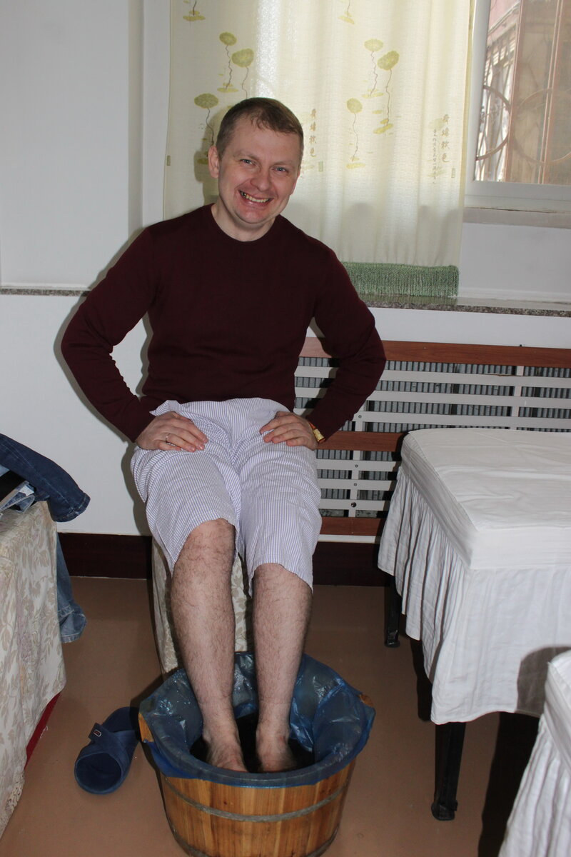 В Китае есть поговорка. "В мире существуют 2 типа людей: китайцы и недокитайцы". Т.е. все остальные рано или поздно станут китайцами. Гуляя по закоулкам Даляня, мы наткнулись на массажный кабинет. Массаж в Даляне На стене здания висела вывеска на инглише, "Массаж головы". Тайский массаж в разных вариациях я уже пробовал. Захотелось попробовать массаж головы по-китайски. Получилось очень даже забавно. Нам предложили снять штаны, выдали широкие шорты. Налили в деревянный тазик чего-то ароматного и оставили отмокать. Потом сделали массаж ног. Массаж делала пара парень и девушка. Мне девушка, а жене парень. Хорошо говорили на английском. Объяснили, что в ногах есть нервные окончания, которые влияют на работу головы! После массажа ног, сделали массаж головы. Тут было больно. Думал, хотят выдавить мозг или выдрать последние волосы. Все обошлось. Но бодрости и хорошего самочувствия прибавилось. После сеанса, как описал в другой статье про Китай, массажисты с нас взяли оплату, но не взяли чаев