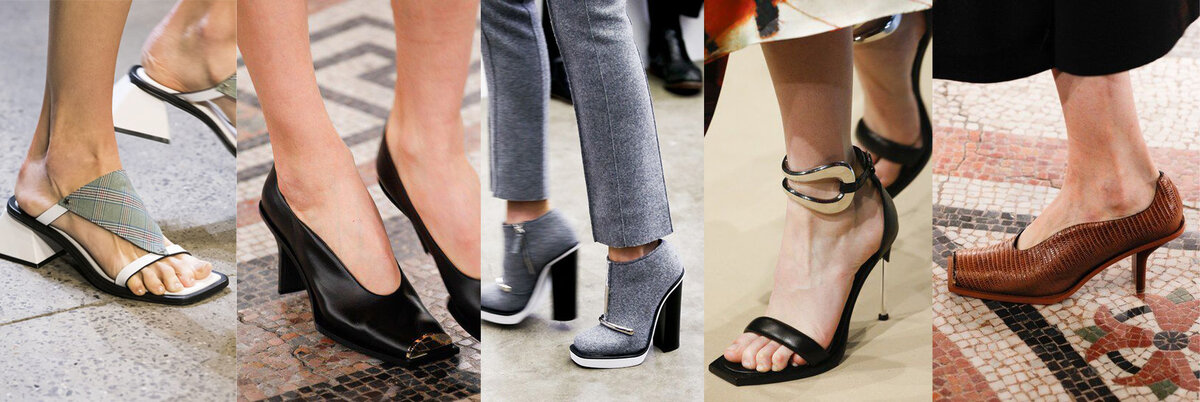 Одним из горячих трендов обуви в грядущем сезоне будет обувь с квадратным носком, которая была на пике своей популярности в 90-х и только сейчас вернулась на подиумы и в гардеробы модниц. Но учитывая, что круглый или острый носок обычно пользуется популярностью у женщин, то красоту квадратного носка видят далеко не все. Большинство считает что он делает ногу неуклюжей и массивной. Но так ли это на самом деле? Или просто все привыкли считать обувь такого плана устаревшей и не актуальной? Стилисты считают, что у такой обуви определенно есть свой шарм и особенно хорошо она будет сочетаться с маскулинными образами. Модель обуви именно с такой формой носка будет очень комфортной для широкой стопы, и кроме этого, такая обувь в основном предлагается с удобным каблуком: широкий миди каблук, высокий широкий каблук, разнообразные киттен-хилы и мюли. Не забывайте, что квадратный носок необязательно должен быть как под линейку, это может быть и более зауженный квадратный носок или же наоборот бол