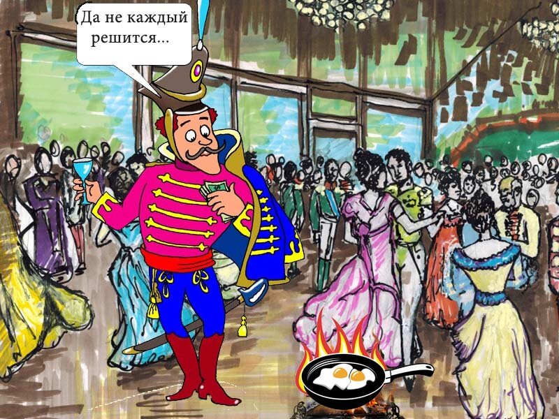 Вспомнились еще два хороших анекдота про поручика Ржевского, спешу поделиться. Вечный поручик, в звании его не повышают, видимо за систематические залеты. Пьер Безухов спрашивает у поручика Ржевского. — Поручик, это правда, что вы занимаетесь сексом шесть раз в неделю? — Да-с, чистая правда. — Но как вам это удается? — Нелегко, Пьер. Это испытание для силы воли, но я взял себе за правило каждую неделю один день воздерживаться. Бал у графини N. Ярко горят свечи в канделябрах, на паркете кружатся пары. Молодые люди флиртуют с девушками, публика постарше ведет светскую беседу. В конце залы накрыты столы с закусками. За дальним концом одного из столов лицом в салат спит поручик Ржевский. Вдруг он просыпается, поднимает голову из салатницы: — Господа! Господа!! Знаете ли вы, как делается яичница?... Опять падает лицом в салат. Шепот в зале. Все одновременно между собой. — Фи, какой он гадкий! Сейчас опять скажет какую-нибудь пошлость, испортит весь праздник!» Поручик, поднимаясь из салата