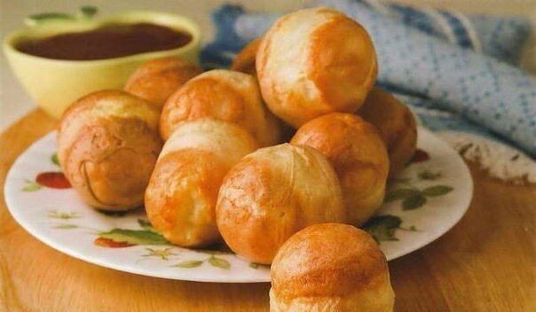 Готовые дутые оладьи выкладываем на бумажные полотенца, они впитают лишнее масло. Сверху их можно посыпать сахарной пудрой, или начинить любым кремом, вареньем.