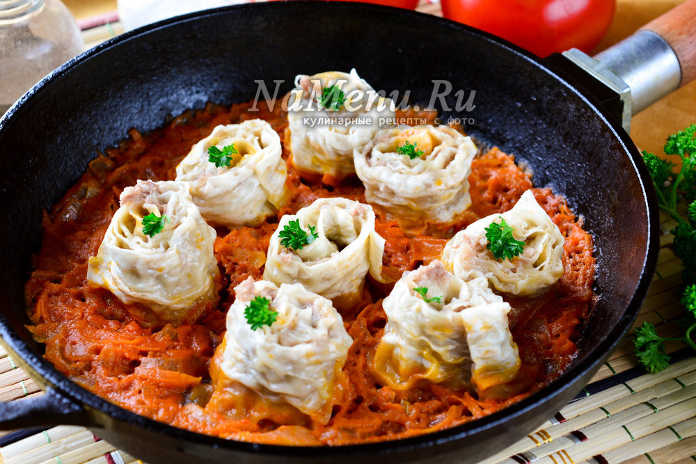 Необходимые продукты: - 1 лист тонкого лаваша; - 400 гр. фарша; - репчатый лук и морковка по 1 шт.; - 2 ч.л. томатной пасты; - 150 гр. сметаны; - 100 гр. воды; - соль и растительное масло 🥄Разложить лист лаваша и намазать его фаршем. Фарш заранее посолить и поперчить 🔪Скрутить лаваш в виде рулета и порезать круглыми кусочками 🥕Морковь натереть на терке, лук порезать 🌻Жарить овощи на смазанной маслом сковороде с добавлением воды, сметаны и томатной пасты 🕰Выложить в слегка кипящий соус ленивые пельмени и тушить при закрытой крышке 15-20 мин. https://namenu.ru/10133/Lenivyee_pelqmeni_iz_lavasha_na_skovorode/