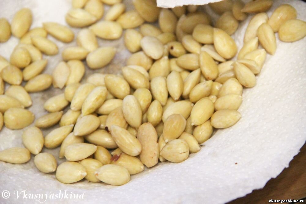 1. Залейте миндаль кипятком и оставьте на 1-2 минуты. Снимите кожуру.