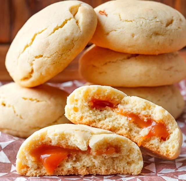 Массу делю на равных 28 частей. Формирую лепешки. На одну лепёшку кладу половинку «Помадки» и накрываю второй лепёшкой. Прищипываю края и выкладываю на подготовленный противень.