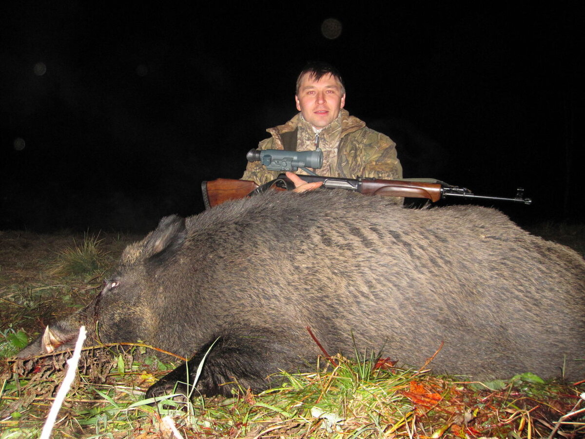 Дело было во время моей службы. Нас отправили на десятую заставу, для выполнения рейдов по горам. В нашу задачу входило выставлять секреты, брать несунов, ну и соответственно самой главной задачей были выходы на караваны. В один из таких выходов, нам удалось взять караван, который переправлял из Афганистана сто пятьдесят килограмм героина. После того как наше командование здало героин в особый отдел, мы отправились на заставу. Возвращаясь нам пришла в голову мысль подстрелить на ужин кабанчика. Поговорив об этом, мы решили, что основной состав группы едет на заставу, а мы втроём идём искать лежку кабанчика. Ходя по горам, мы вышли на кабана. Так как кабан по сути является ночным животным, то соответственно наш кабанчик спал. Мы с Сергеем залегли в кустах, а Саня пошёл в обход лежки, чтобы поднять кабана и гнать его на нас. Лёжа в траве, и ожидая когда Саня выгонит кабанчика на нас. Я маленечко расслабился, и в это время в нескольких сантиметрах от меня, что то сильно зашуршало, от