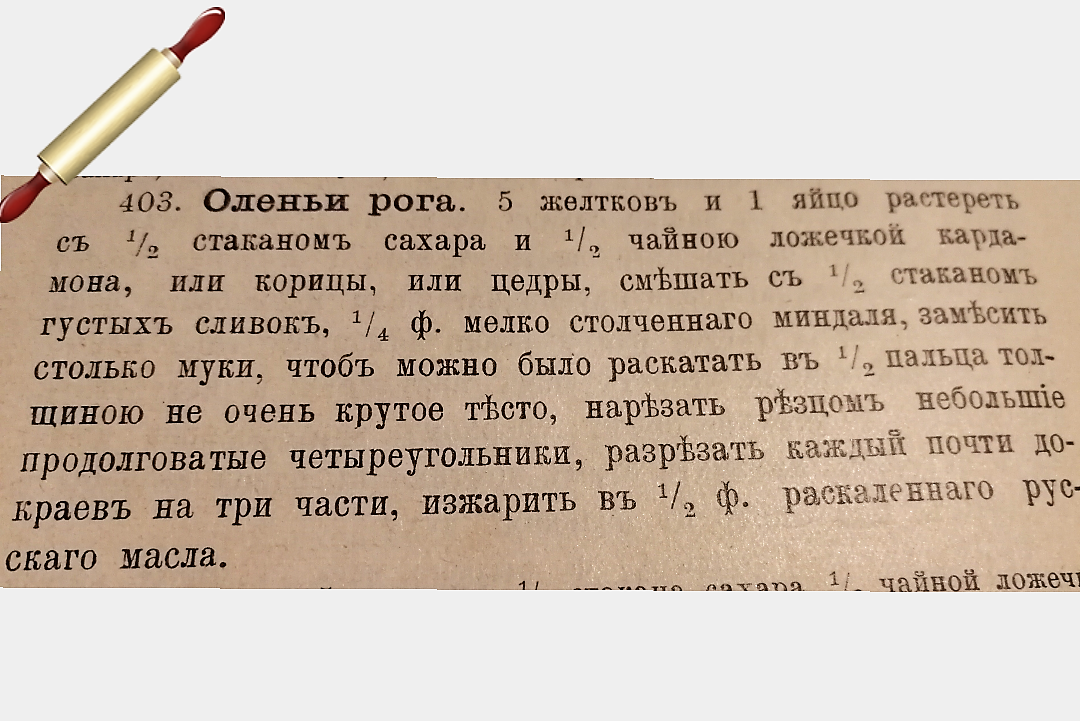 Вы когда-нибудь пробовали готовить оленьи рога по рецепту 19 века? Нет? Я раньше тоже, но сегодня решила попробовать первый раз приготовить по кулинарной 1899 года. Написаны рецепты в этой книге ещё на старорусском языке и измеряется все в фунтах. Я конечно же напишу всё в граммах)) Сейчас я поделюсь этим рецептом и с вами!)) Способ приготовления: Начинаем мы с приготовления теста. Нам нужно у 5 яиц отделить желтки от белков. Желтки отправляем в чашу для теста. Туда же разбиваем одно яйцо полностью. Добавляем сахар 1/2 стакана. Я добавила 100 грамм. И как написано в рецепте растираем яйца с сахаром Добавляем цедру апельсина. По рецепту вообще нужен кардамон, но у меня дома его не оказалось. Но, так как сказано, что можно заменить его цедрой, я добавила цедру апельсина. Хорошо перемешиваем, до растворения сахара. Честно говоря, так и хотелось взять миксер, но я решила соблюдать все правила готовки и делала всё в ручную. Когда сахар растворился, добавляем сливки 1/2 стакана. Т