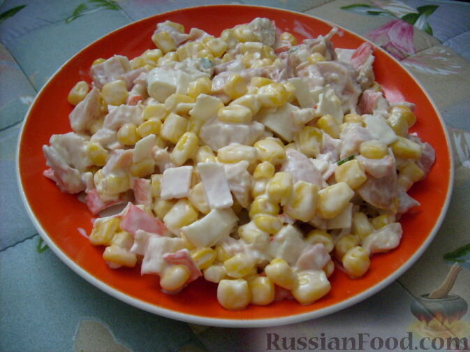Обалденный салат из окорочка и крабовых палочек. Быстро и очень вкусно! Обожаю его! Продукты Копчёный куриный окорочок - 1 шт.Кукуруза - 1 банкаКрабовые палочки - 200 гСухарики - 1 пачка (лучше, если они будут кругленькие и тоненькие, а такие есть в продаже, знаю) Майонез - по вкусу Как приготовить салат из окорочка и крабовых палочек: Окорочок порезать кубиками, крабовые палочки так же. Добавить сухарики и кукурузу. Перемешать с майонезом. Дать постоять минут 15 (пропитаться). И можно подавать вкусный салат из крабовых палочек с окорочком к столу. Ещё в салат из окорочка можно добавить зелени - по вашему вкусу. Легко и быстро.