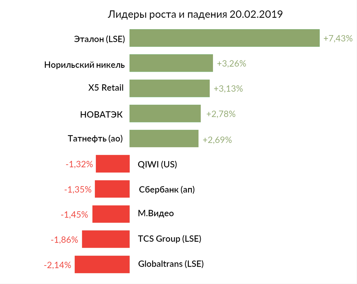 Лидерами роста стали Эталон (LSE +7,43%) на фоне сделки по покупке АФК Системой доли в компании с премией к рынку, Норильский никель (3,26%), X5 Retail Group (+3,3%), НОВАТЭК (+2,78%) после публикации годовой отчётности по МСФО, Татнефть ао (+2,69%).
