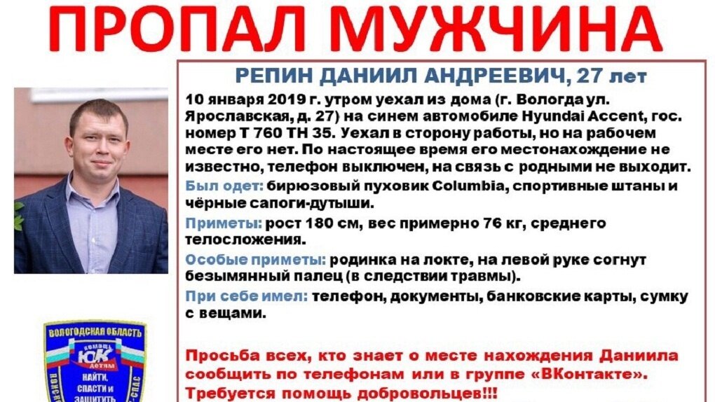 Молодой человек пропал больше месяца назад. В Вологодском районе по факту безвестного исчезновения 27-летнего жителя областного центра возбуждено уголовное дело. Родные, обеспокоенные пропажей родственника, начали самостоятельно поиски уже на следующие сутки. К спасательной операции привлекались спасатели, полицейские, местные жители и добровольцы из Вологды. Спустя несколько дней была обнаружена машина с вещами и документами пропавшего. Но о самом мужчине до сих пор нет никаких вестей. Наши коллеги из "Комсомольской правды" вместе с родственниками Даниила восстановили практически поминутно все крупицы информации. известные на сегодняшний день. "Вероятно, собственное расследование родных дает несколько иные результаты, чем поиски профессионалов, но все же мы публикуем эту информацию полностью, чтобы как можно больше людей узнало об этом и помогло семье, которая несмотря не на что верит и действует", - пишет КП Вологда. 10.01.2019 Даниил Репин примерно в 6:30 выехал на своей машине с
