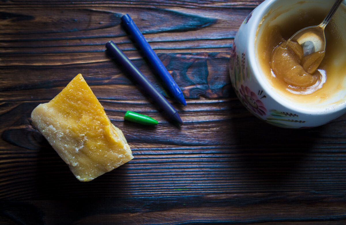 Когда мне было лет 5-6 мой дедушка начал заниматься пчеловодством. Воска дома всегда было много, он был чистый-чистый, переплавленный в различные причудливые формы. А запах! Если представить, что все тепло лета, весь сладкий аромат меда и трав поместили в одну пробирку и дали понюхать - именно так для меня пахли эти волшебные плитки теплого, бархатистого воска! То, что из него можно лепить - мне показала мама. Она сначала клала на батарею пакетик с воском, а потом разминала для меня небольшие кусочки. Здорово, что воск оставался пластичный в руках, а стоило фигурку на пять минут оставить - она застывала и с ней можно было играть. И вот уже я своему сыну решила показать, что из воска, который нам дедушка прислал (ему уже 80, пчелами занимается до сих пор!) можно лепить. Но не просто из воска, а из цветного воска! Все просто: мы растопили воск с остатками от восковых карандашей (делали простую картинку вот тут) в кокотнице из Ашана. Они у нас для мастер-классов разных закуплены. В пр