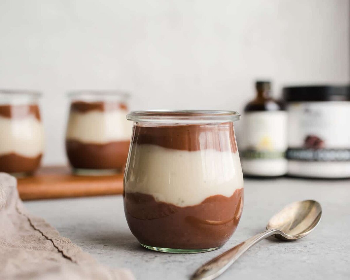 3. Для шоколадного пудинга повторите шаг 1 и 2, но с добавлением какао. Разлейте пудинг в емкости, сверху накройте пищевой пленкой и поставьте охлаждаться на 2-3 часа. Вы можете чередовать шоколадный и ванильный пудинг в емкости, по вашему усмотрению. Также пудинг можно украсить орешками или фруктами. Приятного аппетита!