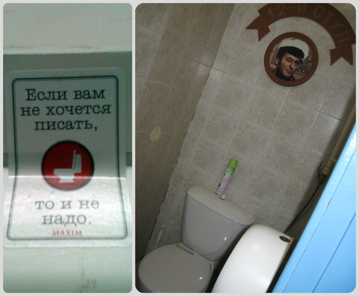 Отыскать туалет с объявлением несложно. Гораздо сложнее отыскать там нестандартный текст, который был бы не пошлым или скрыто агрессивным. Насколько мне это удалось – судить вам. Да, унитаз необязательно использовать по прямому назначению. Например, на нём можно читать: Но даже в качестве места для чтения туалет остается туалетом. И снижает пафос ситуации, как на фотке ниже: Хозяева магазина и на другое окно приклеили высказывание-позитивчик. Не знаю, был ли это стёб или они реально не учли, что их товары не суперподходящий фон для таких пафосных мотивашек... В общественных туалетах люди почему-то не пользуются ёршиками. А иногда и смывом. Такой необъяснимый социальный феномен)) На эту тему есть немало объявлений от сверхвежливого "если ваши возможности превысили ожидания" до грубости. Мне понравились такие: А ещё люблю, когда объявления в стихах. В моей коллекции таких целых три. Экспромт от бабушки: Суперфилософская зарисовка: Поэма "4 в 1" (о четырёх проблемах в одном стишк