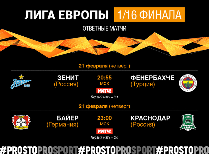 20:55. Зенит (Россия) – Фенербахче (Турция). ТВ: "Матч ТВ"