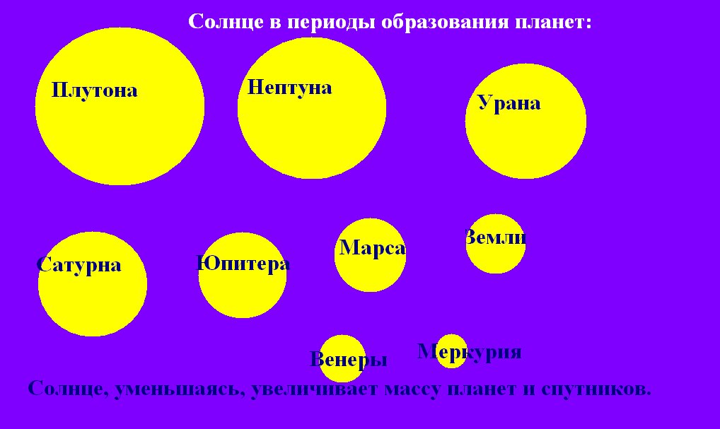 В предыдущей статье показано, как формируется одна планета в солнечной системе. Сейчас на рисунке видно, как Солнце уменьшаясь, наращивает планетную массу вокруг себя. Не менее интересно, как же произошли спутники на планетах? Здесь так же, достаточно показать формирование одного спутника и вы сами можете завершить мысль. Итак, сначала у нас на Солнце соединились два огромных энергетических облака с разными зарядами, образовав планетную массу. А на что теперь способна эта будущая планета, находясь в нейтральной, то есть, в средней сфере Солнца? У будущей планеты огромный период времени до освобождения от всех его сфер! Планетная масса под действием сжатий и расширений сфер Солнца - это приливы и отливы энергии его, получает вращения вокруг своей оси. Ну, а планета, вращаясь в энергетической среде обитания, поворачивается то к положительным сферам, то к отрицательным разными своими полюсами. Так образуются микро планеты, которые вращаются за счёт импульсов Солнца и вращения планет