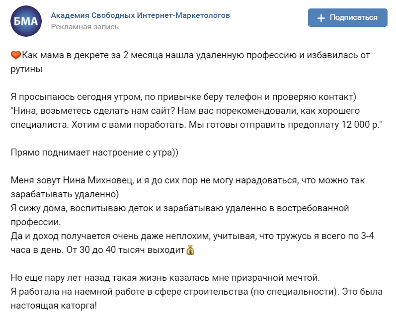 Как же меня достала тупая реклама "ВКонтакте". Я понимаю, что уже писала про то, что нельзя верить интернетовским миллионерам с душераздирающими историями, но... не смогла сдержаться. Уже какой день вижу в своей ленте "ВК" вот это: Это всего лишь часть удивительной истории. Остальное разберем по ходу. Во-первых, 3-4 часа в день, от 30-40 тысяч. Это прекрасно. Нет, я не отрицаю, что некоторые так работают и зарабатывают, НО никак не люди, которые буквально вчера начали. И тут очень сильно зависит от специальности. Человек делает сайты. Запомним. Клиенты сами разрывают телефон звонками и предлагают предоплату. Ммм... сказка просто! Тоже так хочу. Идем дальше. А что за менеджер интернет-рекламы. Что конкретно делает человек? Интернет-маркетологов знаю, а менеджеров... или это чтоб круче звучало? А ничего, что несколько абзацев назад человек сайты делал??? Нет, digital-маркетинг, конечно, сфера обширная, но сами маркетологи сайтов не делают. Этим занимаются веб-дизайнеры, разработчики