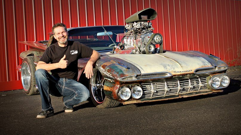 Chevy El Camino — машина на любителя, полу-грузовик, полу-легковушка, — многие не уверены, как их воспринимать. Я большой любитель таких тачек, и с большим удовольствием разглядывал много потрясающих проектов, но ни один из них не был столь адским, как этот «пятьдесят девятый» Криса Уолкера, созданный людьми из ITW Hot Rods. Плачевное состояние донора позволило воображению Криса разгуляться до максимума и он построил свой «ХалкКамино» практически с нуля. В тотально укороченном кузове прослеживается влияние Эда Рота, когда машина смотрится, будто оживший «мультяшный» рисунок. Линии, стремящиеся сойтись в одной точке где-то впереди в купе с разноширокими колесами формируют стремительный облик, а грубое оформление передка как бы говорит: «Чувак, мне абсолютно пофиг, что ты там обо мне думаешь». Халк Камино не просто шоу-стоппер. Крис строил его, чтобы круизить и отжигать. Мотор — «биг блок» с 671 чарджером и четырьмя карбами Holy 750. Соединенный с усиленым мостом Dana 60, он выдает дос