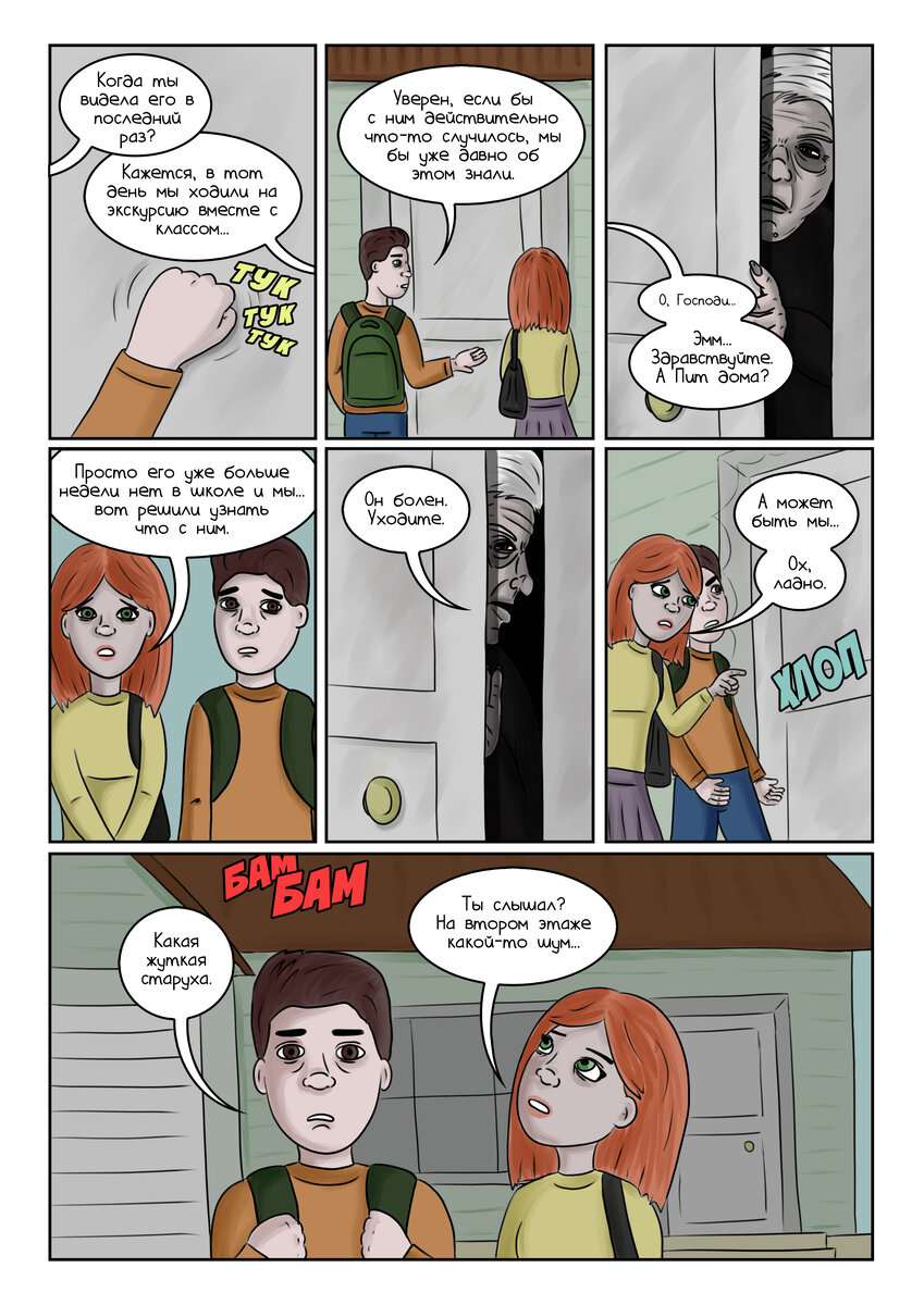Мой комикс на трех страницах, в котором всем известный сюжет о становлении одного очень популярного персонажа предстает совсем под иным углом. Школьные друзья пытаются выяснить, что случилось с их одноклассником, но оказывается, что это не так-то просто. Что же скрывает тетя пропавшего подростка? Читайте - и узнаете! Конец... Новые ужастики еще обязательно появятся на канале. Также вам может быть интересно: - Хоррор-комикс «Банник» - Почему не стоит ходить в баню одному - Нуарный комикс с неожиданной концовкой - Что скрывает человек в шляпе? - «Пятница 14-е» - серия кровожадных и одновременно милых комиксов о маньяке и его маме