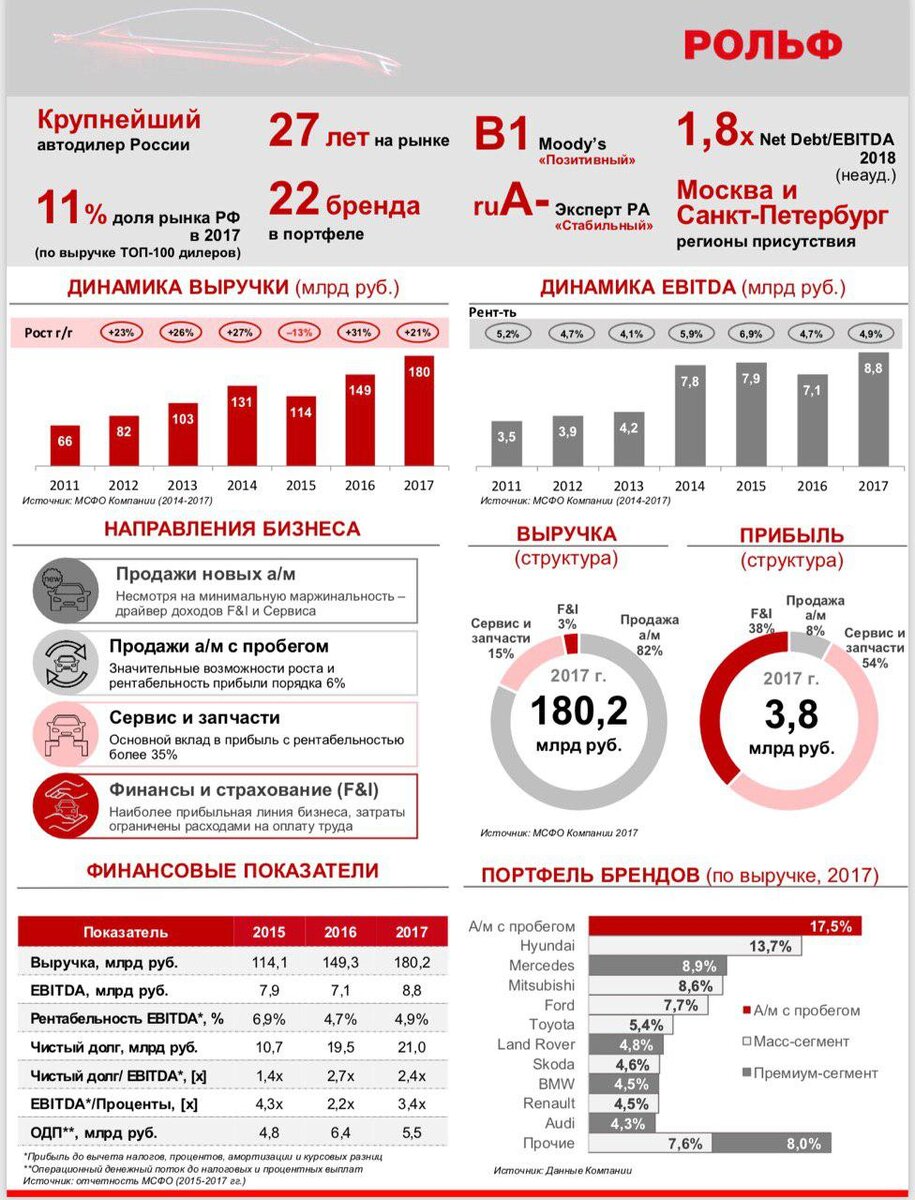 Рольф работает в Москве и Петербурге, продает и обслуживает как масс-маркет, так и премиальные марки. За 2017 год получили выручку 185 миллиардов рублей, неплохо.
