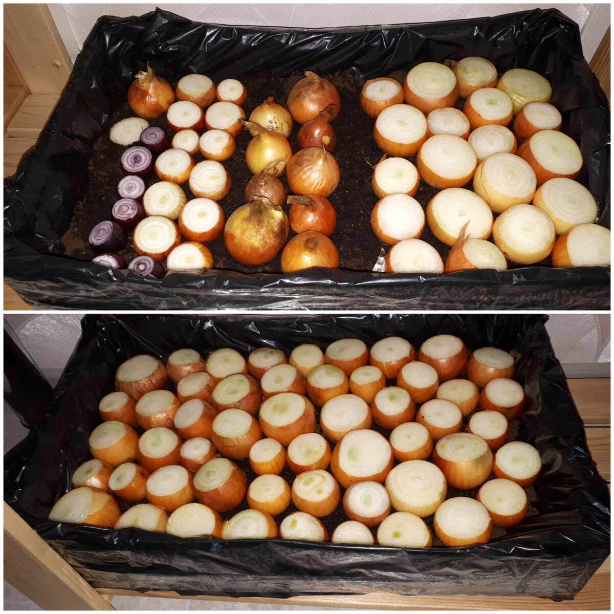 Наконец-то, наступил час Х. Сегодня я сажаю лук и семена. Заполнила ящики землей, пролила сильно разбавленным удобрением из гранулированного куриного перегноя. Разбавила примерно в 2 раза больше, чем требует инструкция. Я в этом деле новичок и не хочу сжечь корни. Лука я купила на рынке примерно 10 килограмм по цене 23 рубля. Дома осуществила выборку и самые крупные головки были отправлены на кухню и будут использованы в гастрономических целях. В сухом остатке 6 килограмм с учетом то, что мама поделилась остатками своего мелкого лука. Лук был замочен на 19 часов и я приступила к посадке. Каждую луковицу я обрезала примерно на 1/5 и втыкала в землю. Обрезала и обливалась горючими слезами. Всем советую открывать окна и одевать очки. Я об этом не подумала, поэтому сажала лук со слезами на глазах. Сразу решила, что эспериментам быть! Поэтому один ящик был плотно засеян обрезанным луком мостовым способом. Во втором ящике расположились: -обрезанный лук -необрезанный лук -отдельно посажен сво