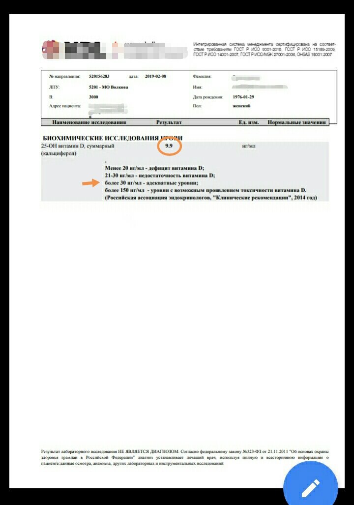 Сегодня постараемся на конкретном примере, понять: 1. Как определить уровень витамина D в организме. 2. Как выбрать нужную дозировку витамина D. 3. На что обратить внимание при покупке, и какая форма витамина D самая выгодная? 4. Сколько времени его принимать. Недостаток витаминов в зимний период существуют у 8 человек из 10. В этом недавно убедилась одна моя хорошая знакомая, сделав анализ крови на витамин D. Результаты вы можете увидеть сами - менее чем треть от нижней границы существующей нормы. Ранее я уже писал об этом витамине и его источниках в пище. Тогда я сделал вывод, что восполнить этот витамин определённой пищей - практически невозможно. Тем не менее витамин D, жизненно необходим. Его дефицит приводит к развитию: - пародонтоза, - размягчения костей, - увеличению резистентности к инсулину, - болезням сердца и сосудов, - развитию аутоиммунных процессов (псориаз, аллергии, ревматоидный артрит, астма), - снижения мышечной силы, - бессонницы, хронической усталости, - фактора