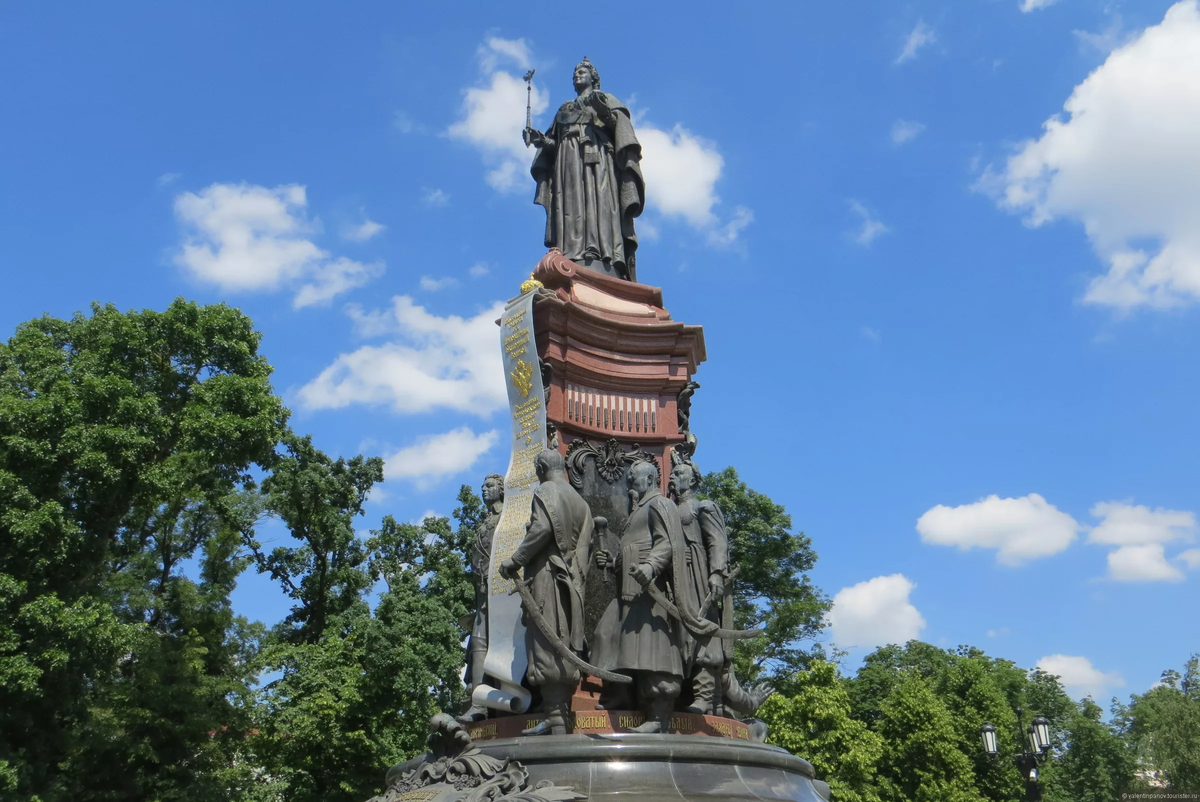 Работу над проектом памятника императрице начал выдающийся художник и скульптор Михаил Осипович Микешин к 100-летнему юбилею переселения казаков Черноморского войска на Кубань. Заказ на скульптуру поступил художнику от Краснодарского казачьего общества. По замыслу М. О. Микешина, памятник должен был стать «наглядной историей Кубанского казачьего войска от его начала до нынешних дней». В январе 1893 г. скульптор сделал первые наброски скульптурной композиции. Но завершить свою работу автор не успел, 31 января 1896 г. он скоропостижно скончался.