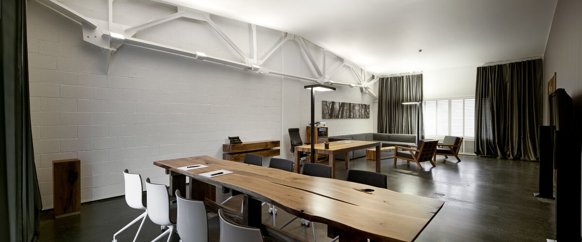 Создавая в бывшем фабричном цеху офис площадью 130 квадратных метров, команда Ryntovt Design думала вовсе не о канонах. Одной из главных задач было грамотное зонирование вытянутых пространств. Серая стена-перегородка с теневым фризом по всему периметру, словно парит в воздухе, лишая всякие надежды мещанских плинтусов и фризов на появление в интерьере (плинтус, кстати, отсутствует везде), и разделяет помещение на две основные части: с одной стороны — приемная и кабинет заместителя, с другой — кабинет директора. Офис ожил благодаря деталям и дизайнерским элементам ручной работы. Грубые промышленные поверхности эффективно контрастируют с тонкими вкраплениями природы: ахроматические узоры с изображением стволов деревьев, напечатанных на холсте, покрывающем стены, и
