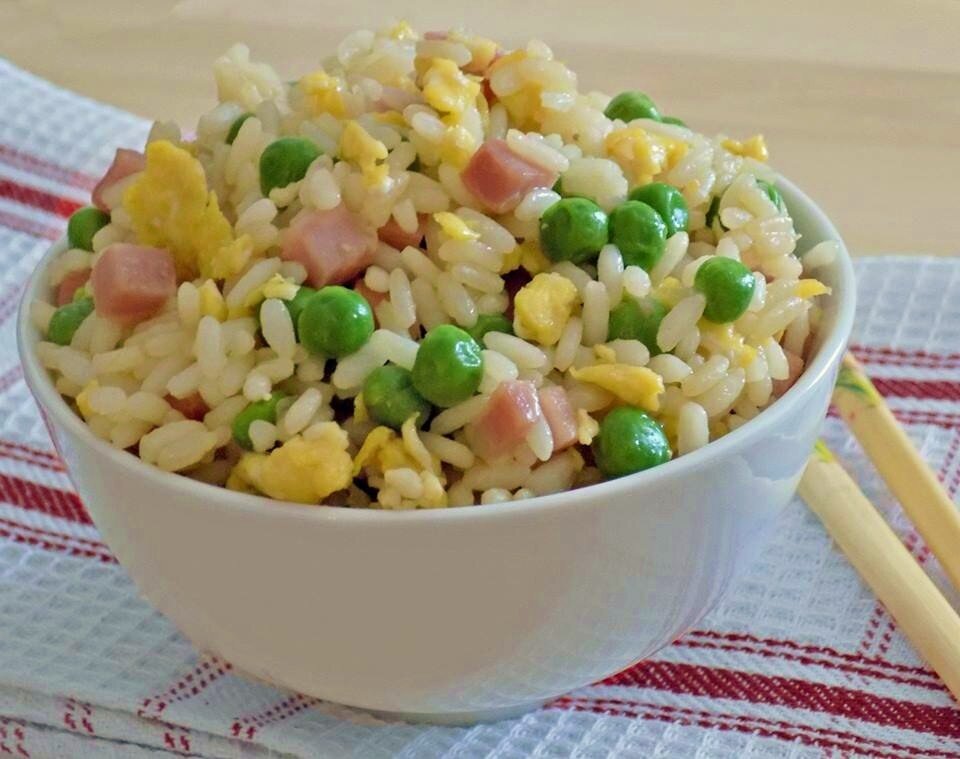 КИТАЙСКАЯ КУХНЯ Рис по-кантонски -это вкусное, легкое и оригинальное блюдо китайской кухни. Если вы любите китайскую или азиатскую кухню, а так же просто хотите разнообразить ваше меню и приготовить что -то интересненькое, тогда этот рецепт именно для вас. Все очень просто ,но как вкусно!!! ИНГРЕДИЕНТЫ ПРИГОТОВЛЕНИЕ Для начала нужно хорошенько промыть рис под холодной проточной водой, пока вода не станет прозрачной (1) Это позволяет убрать лишний крахмал из зерен риса и таким образом он не будет слипаться. Переложите рис в кастрюлю и залейте его большим количеством воды (где-то в два раза) (2). Посолите (3), накройте крышкой и поставьте на средний огонь и готовьте где -то 15-20 мин( в зависимости от риса) , не переварив его. А пока позаботьтесь о приготовлении других ингредиентов: вымойте и почистите лук ( в данном случае использован зеленый ), затем порежьте его (4). Порежьте также на кубики ветчину или колбасу (5) и взбейте яйца (6)-из них нужно будет приготовить отдельно омле