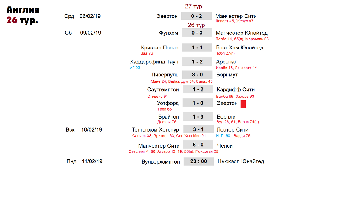 Уотфорд бился с Эвертоном и добился минимальной победы. Уотфорд в этом сезоне сильнее «ирисок», однако преимущество в этом сражение было на стороне ливерпульцев. Но как говорится: «победителей не судят». На 95 минуте футболист Эвертона Зума получил 2 желтые карты и был удален.