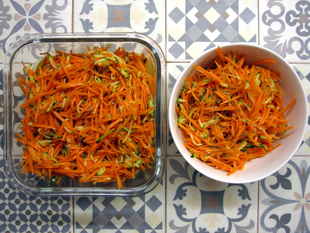Супер хрустящая и немного остренькая морковка с цукини по-корейски. Отлично подойдет в качестве закуски или вместо гарнира. Ингредиенты: Как приготовить морковь с цукини по-корейски: 1. Подготовьте необходимые продукты. 2. Натрите морковь и цукини на специальной терке для моркови по-корейски, которая натрет все соломкой. 3. Добавьте соль, перец и сахар. 4. Раздавите чеснок в чеснокодавке или очень мелко нарежьте. 5. Доведите масло с уксусом до кипения. 6. Влейте в салат и тщательно перемешайте. 7. Дайте салату постоять и напитаться ароматом. Я делаю не сильно острый салат. Если хочется острый, то можно добавить красного перца, больше черного молотого и чеснока. Приятного аппетита! Подписывайтесь на мой канал, ставьте лайки и делитесь рецептом с друзьями.