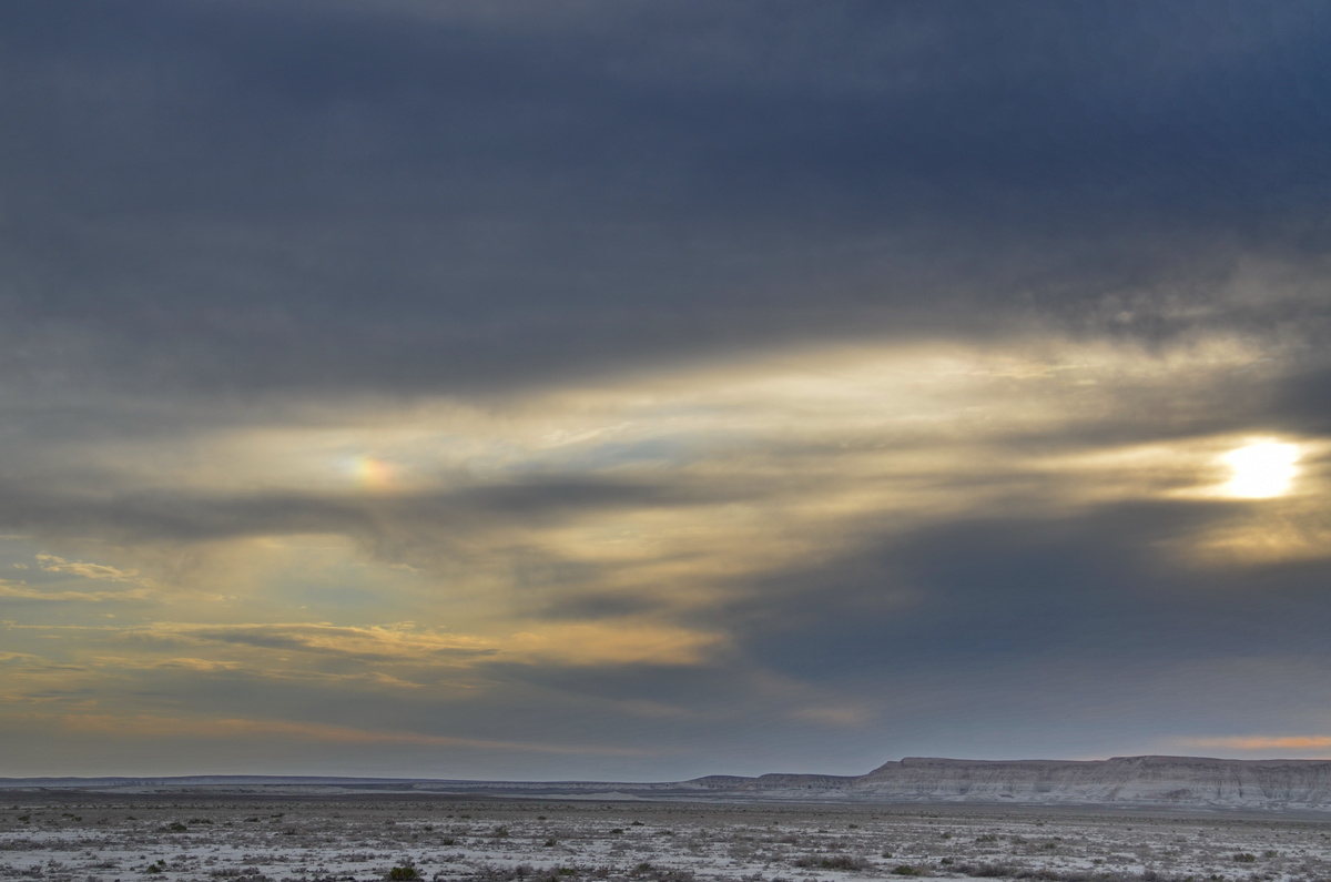 Решив сделать ноги с Босжиры, нам пришлось немного поменять маршрут. На горизонте сверкали молнии и висели свинцовые тучи. Оказаться после дождя в раскисшей глиняной пустыне нам совершенно не улыбалось, так что срочно ищем другое место под ночевку. Надо сказать, что в итоге не пролилось ни капли дождя, но о содеянном мы не пожалели. Не все дороги здесь имеют начало и конец. Так что для начала изрядно поплутав, мы все-таки заехали на каменистый гребень, возвышающийся метров на 10 над окружающей равниной. И главное, он лежал рядом с намеченным нами маршрутом. Дождя мы избежали, но именно здесь мы первый раз столкнулись с пустынным ветром. Он начинался ближе к ночи и достигал своего пика часам к 3-4. Даже палатки установить стало некоей проблемой, первый раз в этой поездке ставили капитально на растяжки. Посреди ночи со столов полетела вся посуда - а оставляли только чугунные сковородки и кастрюлю. Больше мы так не шутили. Одной из палаток была высокая семейная - ее просто сносило,