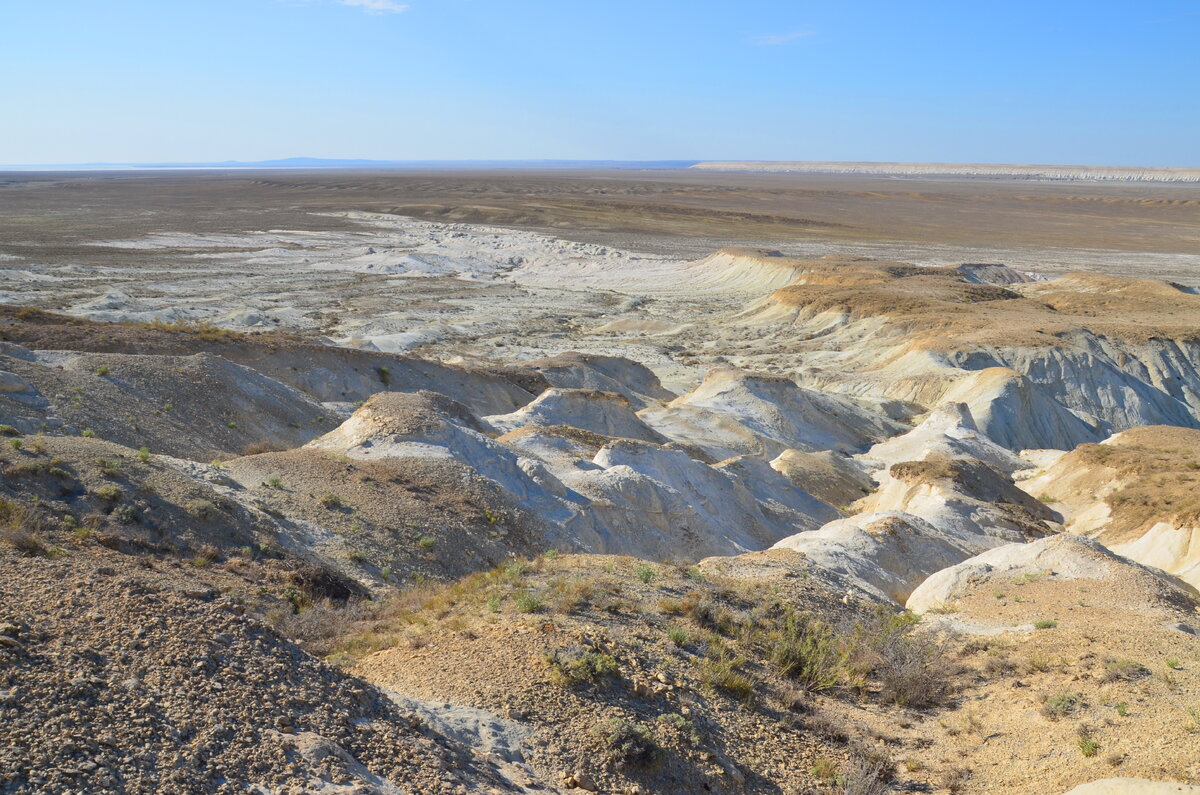 Сегодня наш путь лежит в сторону песков Сенек. Но по дороге у нас еще много всего интересного. Впрочем, весь Мангышлак не устает нас удивлять каждый день. Перед нами разворачиваются все новые картины. Причем, пока ты не подъедешь практически к обрыву, ничего и не видно. Вообще-то это место у меня проходило под кодовым названием "Красные скалы". На самом деле они оказались сложены пластами самых разных оттенков. Что, впрочем, не делало их менее интересными. Тем временем, пока мы разглядываем окружающую местность, идет процесс выбивания фильтров. Впрочем, здесь это практически ежедневный ритуал. Есть вариант ехать верхом, но нам хочется спуститься вниз. И рассмотреть все поближе. Посмотреть есть на что. После Босжиры здесь все прямо-таки играет красками. Дно долины высохший такыр. Мягкий, пружинящий, но ехать по нему приятно. Дальше он переходит в высохший сор. Проехать по нему можно летом. Ведь по своей сути сор -это соленное озеро. Пусть и с очень маленькой глубиной. Весной