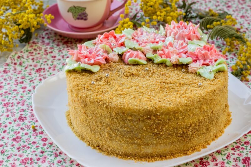 Обсыпаем торт со всех сторон. В принципе, на боках будет достаточное количество крема, чтобы крошка прилипла. Но можете оставить немного крема, которым промазывали коржи, чтобы «сдобрить» им поверхность вашего медовика перед тем, как наносить крошку. Однако, если будете так делать, советую приготовить чуть больше крема, чем указано в рецепте. Украшаем торт, как хотим! У меня это цветочки из крем-чиза на масле — полнейшая импровизация, очень быстрая, чтобы утилизировать остатки. Но получилось вроде бы неплохо!