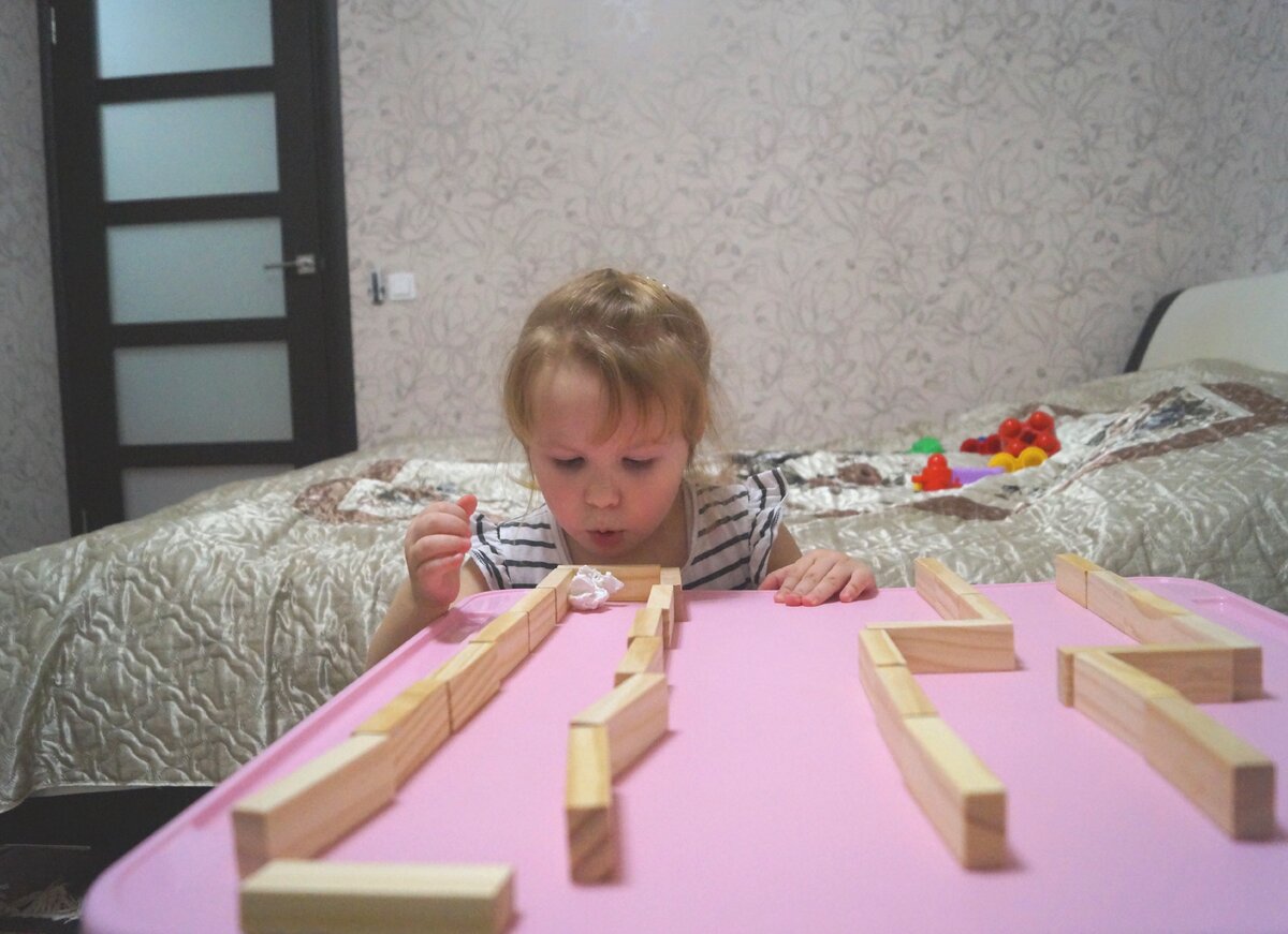 Заборчик можно построить из чего угодно - кубики, карандаши, маленькие коробочки. У нас это деревяшки из Фикс прайса (покупали за 200 руб). А задували мы смятую салфетку. Эта игра не только приносит яркие эмоции и веселит. Она ещё и полезна развитием дыхания. Во как! Для чего это нужно? Правильное (физиологическое) дыхание поможет ребенку научиться говорить спокойно, плавно, не торопясь. Поскольку звуки речи образуются при выдохе, его организация имеет большое значение для постановки речевого дыхания и голоса. Поэтому целью игры является тренировка длинного выдоха, тренировка умения рационального расходовать запас воздуха во время речи. А если сделать не прямую линию, а усложнить задачу углами, то будет ещё интереснее. Ребёнок поизучает пространство - подумает с какой силой и с как