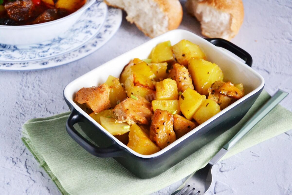 Рецепт из повседневного меню. Готовить быстро. Состав ингредиентов доступный. Результат отличный! Все что нужно для семейного ужина. Филе индейки с картошкой – питательное и вкуснейшее блюдо. Оно выгодно тем, что дополнительно с гарниром возиться не нужно. Мясо и картошечка готовятся одновременно. Рекомендую всем, кто ценит простые и быстрые блюда! Калорийность – 115 ккал/100 гр Ингредиенты (4 порции) · индюшка (филе) – 500 гр; · паприка (молотая) – 1 ч. л; · соль – по вкусу; · свежемолотый перец – по вкусу; · картофель – 500 гр; · чеснок – 4 зубчика; · базилик (сушеный) – 0,5 гр; · растительное масло – 2 ст. л; · лавровый лист – 2 шт; · карри – 0,5 ч. л Как готовить Моем и обсушиваем бумажными полотенцами индюшку. Нарезаем ее на ломтики среднего размера. Перекладываем мясо в емкость. Солим, перчим, добавляем карри и подходящую для приготовления птицы приправу. Чеснок мелко рубим ножом. Очищенную, помытую картошечку также нарезаем небольшими кусочками. В отдельной мисочке приправляе