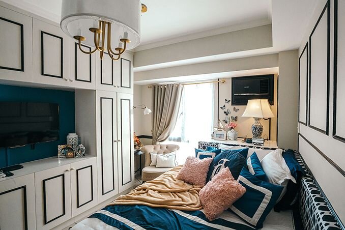 Дизайнеры студии TKSL оформили крохотную квартирку для девушки, которая не только принимает гостей, но и коллекционирует обувь! Поэтому здесь есть всё необходимое для большой компании и максимально вместительная система хранения, а также полноценная двуспальная кровать. Единственное окно и вытянутая форма студии определили планировку – у окна появилась зона отдыха, а в глубине квартиры – кухня и санузел. Причём едва ли не четверть комнаты занимает двуспальная кровать. Её «замаскировали» – добавили декоративных подушек и пледов, чтобы она стала похожа на диван. К тому же предусмотрели «спинку» – мягкий бортик по периметру кровати. Для него выбрали ткань с узором solihiya, который повторяется на скамье и кухонном фартуке. Это придаёт интерьеру целостность и завершённость. Одинаковое оформление выбрали и для стен, причём оно нетипично яркое для малогабаритки. Фасады шкафа и стену напротив декорировали чёрными молдингами, а в качестве акцента использовали бирюзовый цвет. Под шкаф от