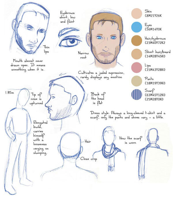 Так как это ваш первый опыт такого рода, не бойтесь переборщить с деталями. Со временем и определенным количеством практики вы сможете избавляться от лишних деталей. Наслаждайтесь процессом! В качестве примера, я создала листок с информацией о своем друге, с которого я рисовала своего персонажа Адриана. Тут содержится множество деталей о нем, одна из которых - вечно бесстрастное выражение лица.