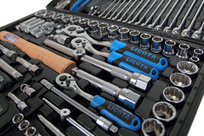 В компании придерживаются самых высоких стандартов качества. В наборе имеется все необходимое для универсальной работы: комбинированные ключи 6-24 мм, торцовые головки 5-32 мм, ключи торцевые, шестигранные, удлинители, отвертки, клещи.